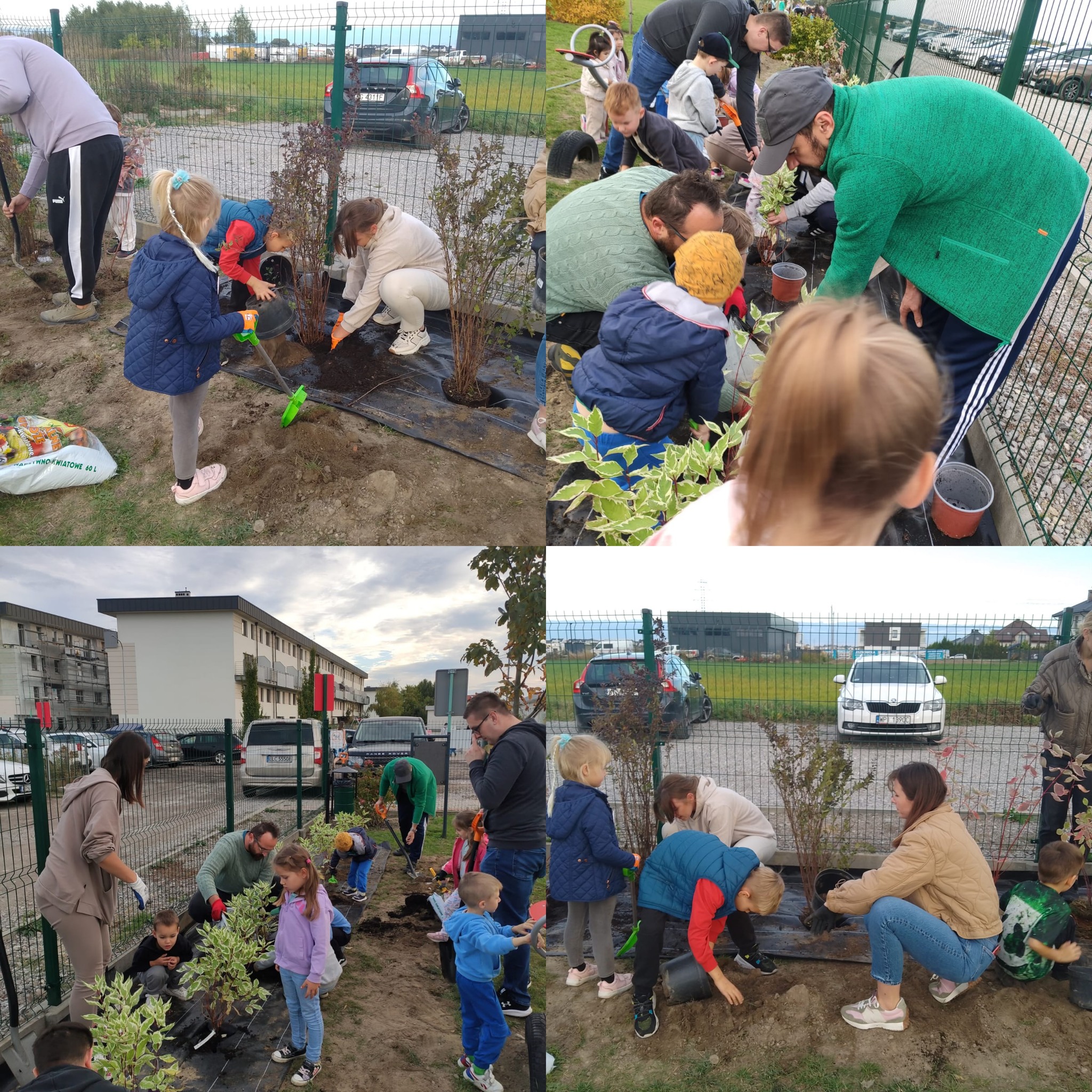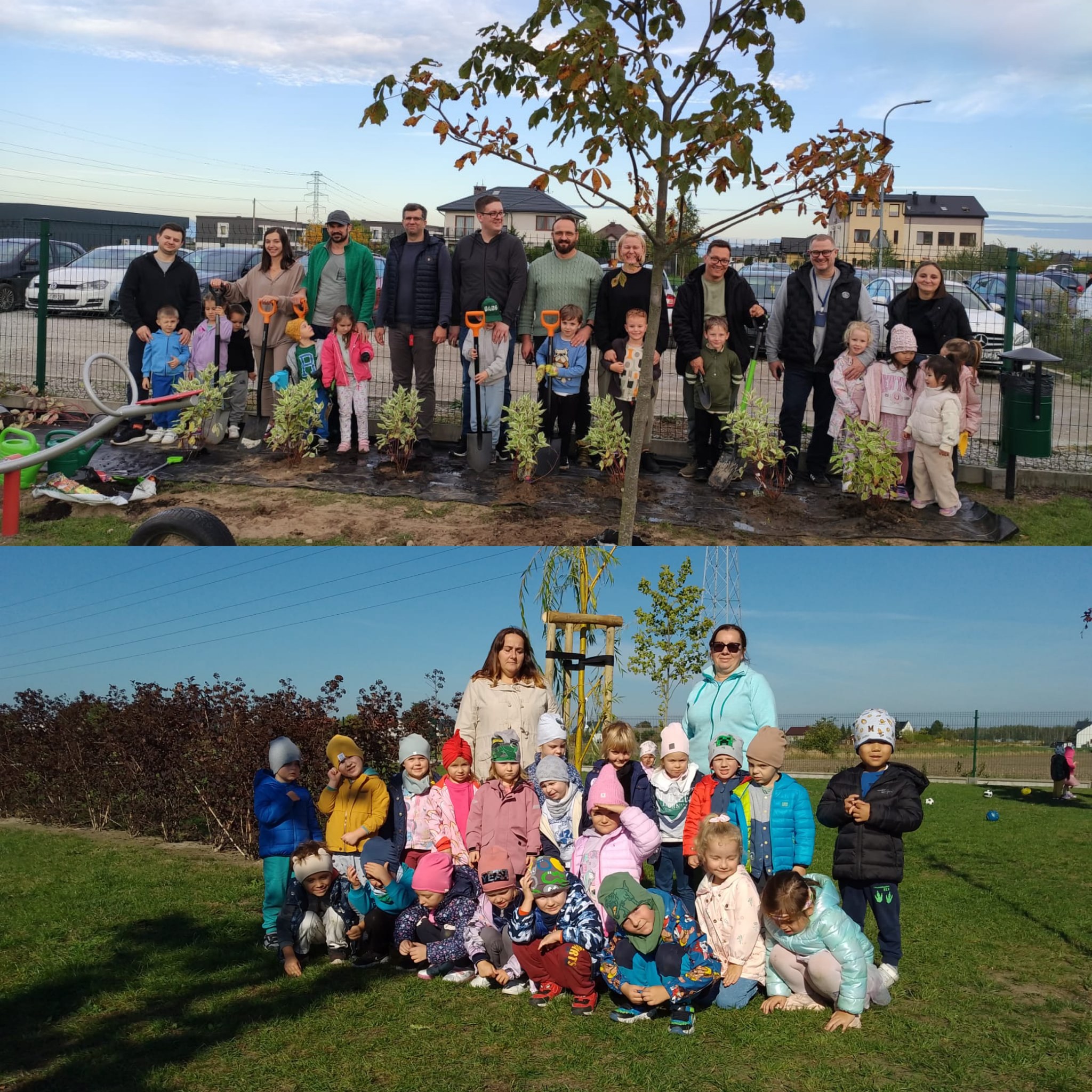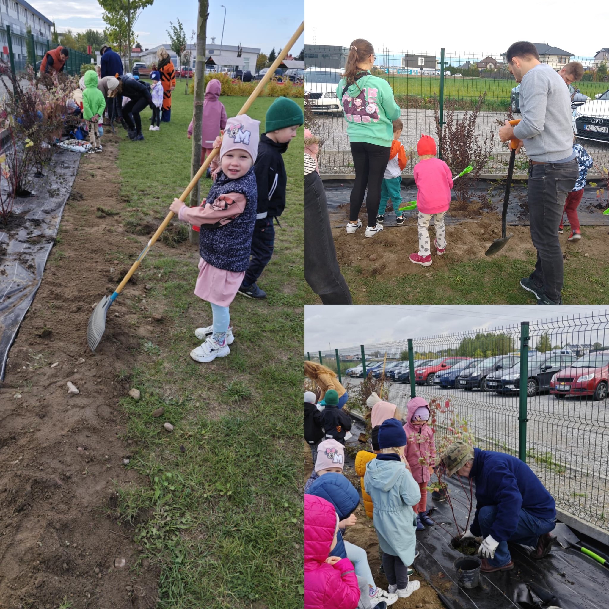 „Dzień Drzewa” w naszym przedszkolu zaczął się bardzo aktywnie. Tatusiowie z grupy “Jagódki” - p. Marcin Maciołek, p. Łukasz Rokita, p. Piotr Kufel oraz niezastąpiony p. Marcin Wrochna, kopali dołki i przygotowali stanowiska pod sadzonki krzewów. Pan ogrodnik, a prywatnie też rodzic - p. Przemysław Prygoń posadził z dziećmi z grupy “Jagódki” piękną wierzbę. Natomiast po południu rodzice z grup “Żabki” i “Jagódki” wspólnie ze swoimi pociechami posadzili krzewy na przedszkolnym placu zabaw. Do akcji w kolejnym dniu przyłączyły się także dzieci i rodzice z grup “Misie” i “Tygryski”.