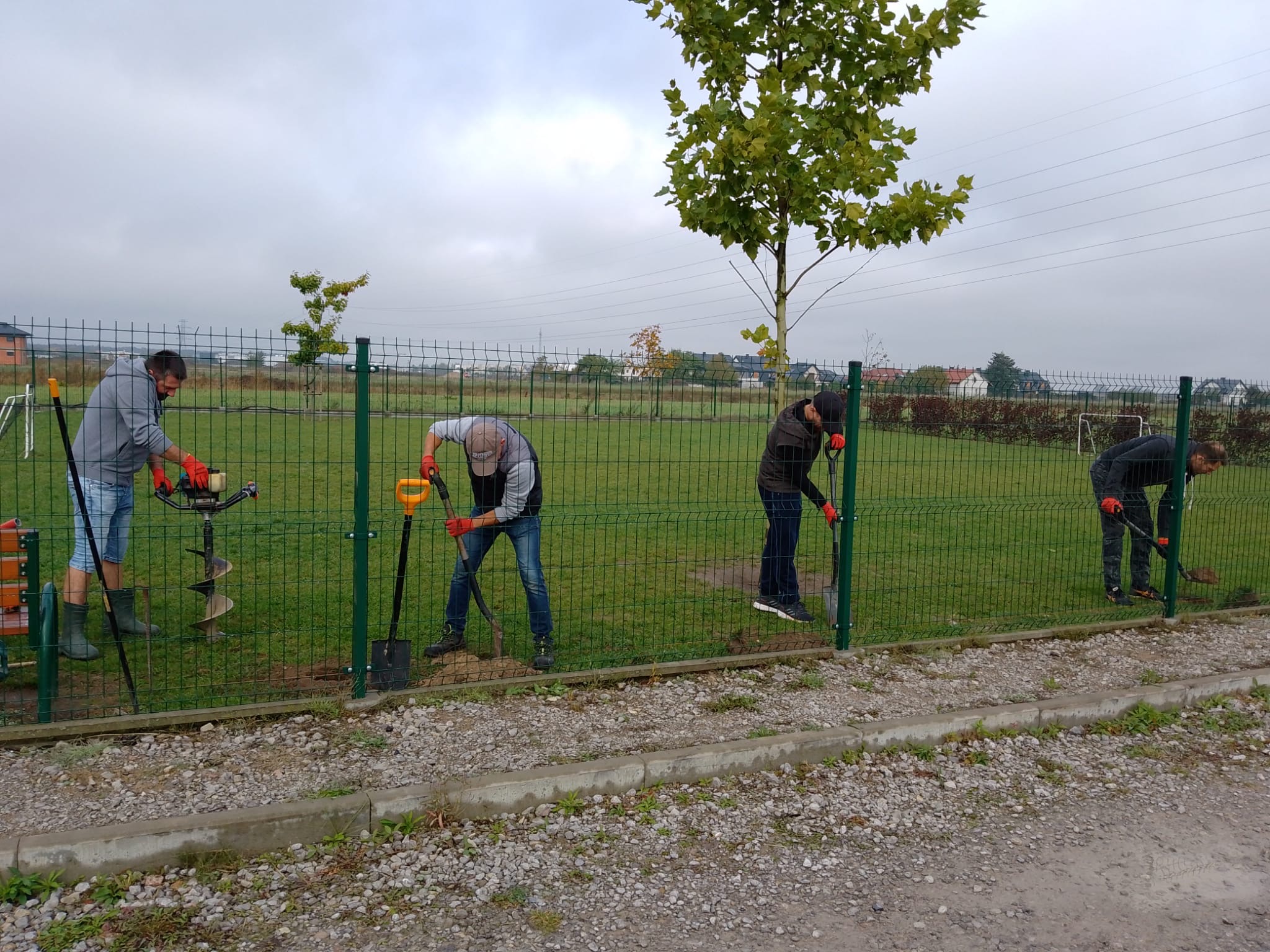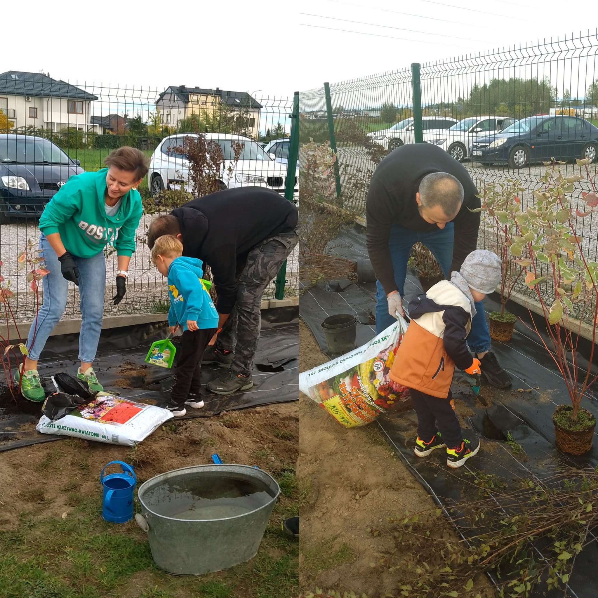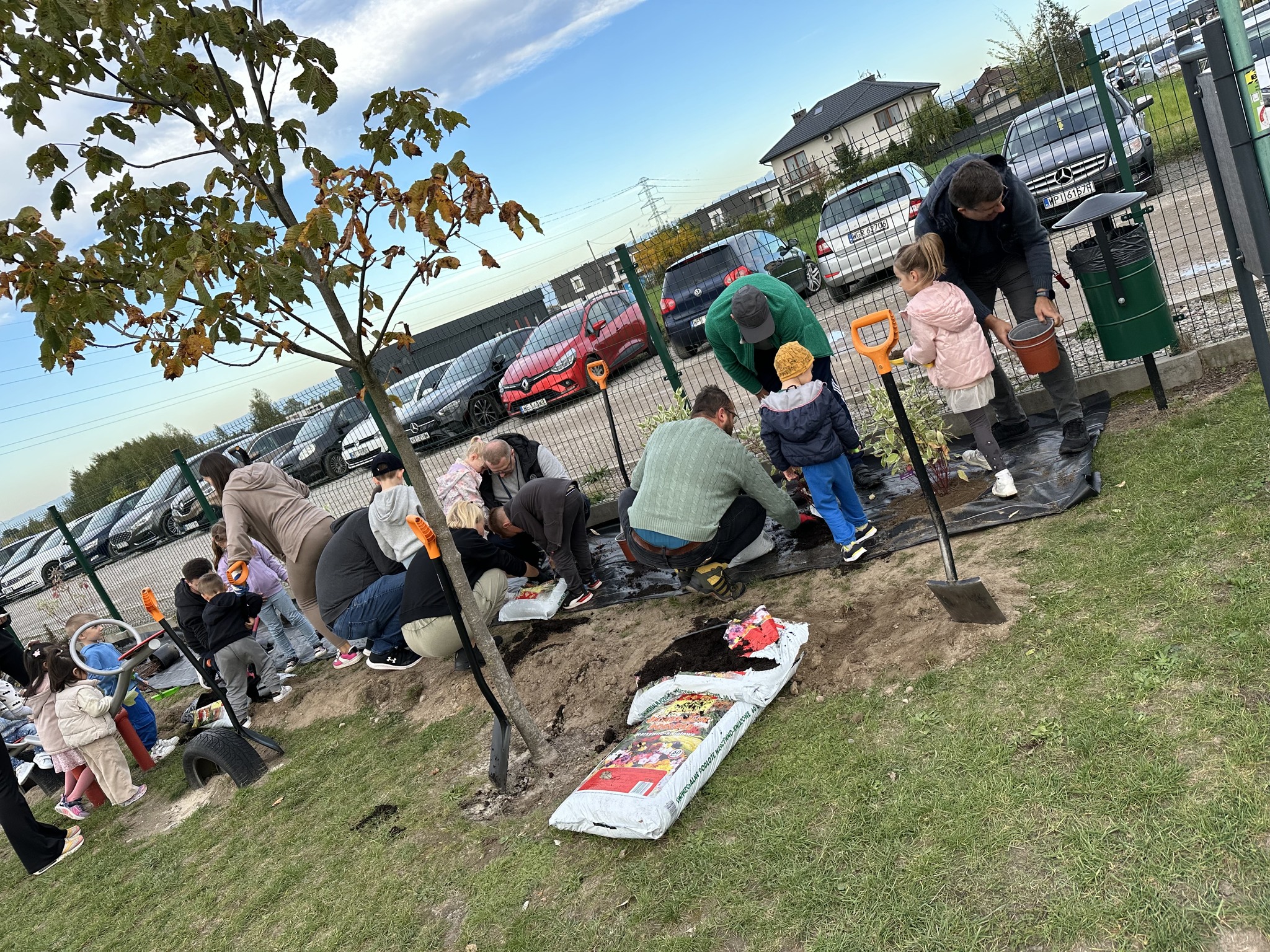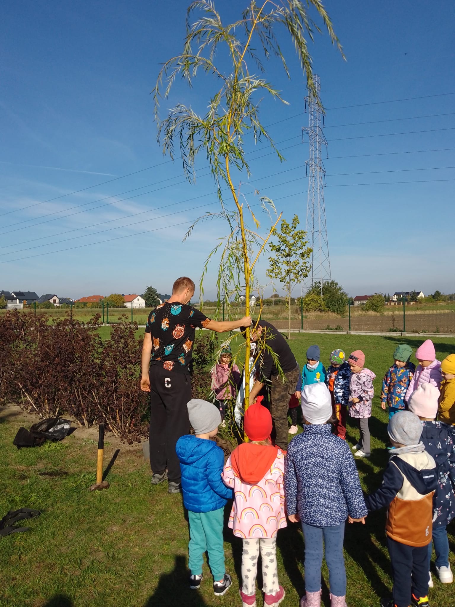„Dzień Drzewa” w naszym przedszkolu zaczął się bardzo aktywnie. Tatusiowie z grupy “Jagódki” - p. Marcin Maciołek, p. Łukasz Rokita, p. Piotr Kufel oraz niezastąpiony p. Marcin Wrochna, kopali dołki i przygotowali stanowiska pod sadzonki krzewów. Pan ogrodnik, a prywatnie też rodzic - p. Przemysław Prygoń posadził z dziećmi z grupy “Jagódki” piękną wierzbę. Natomiast po południu rodzice z grup “Żabki” i “Jagódki” wspólnie ze swoimi pociechami posadzili krzewy na przedszkolnym placu zabaw. Do akcji w kolejnym dniu przyłączyły się także dzieci i rodzice z grup “Misie” i “Tygryski”.