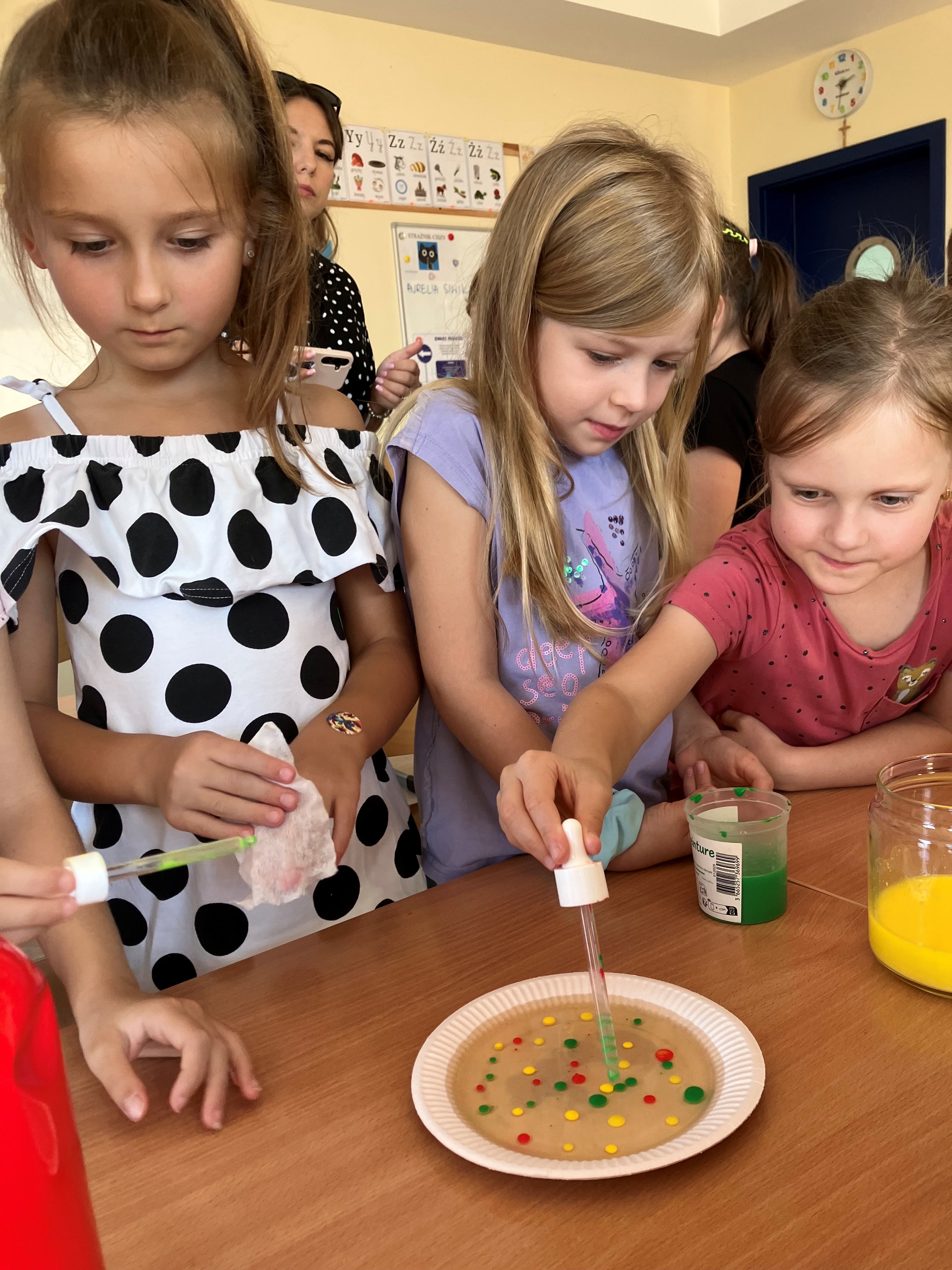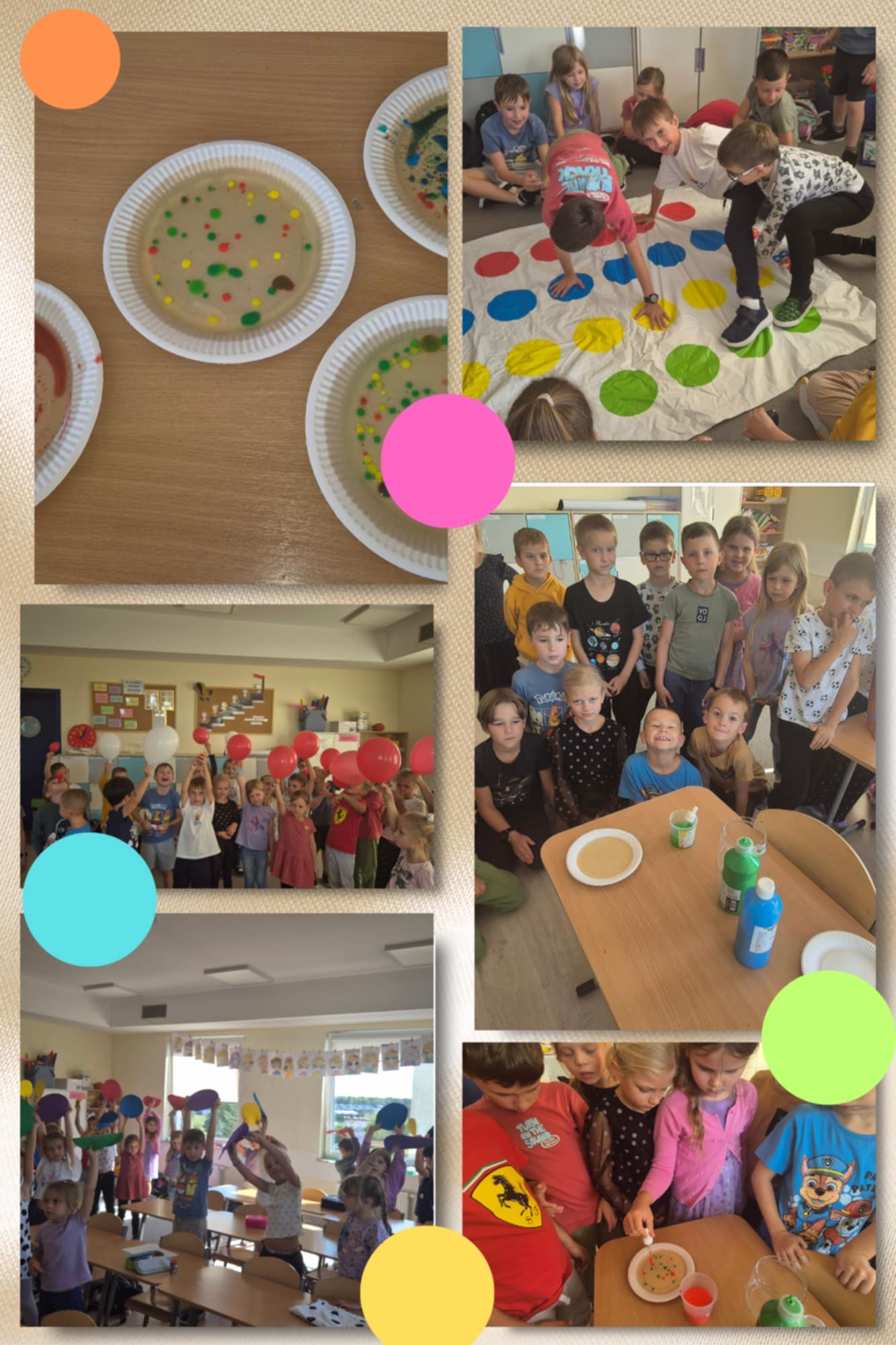 W poniedziałek 15 września 2025 r. w świetlicy szkolnej dla klas pierwszych obchodziliśmy święto kreatywności czyli Międzynarodowy Dzień Kropki. Z tej okazji w ramach zajęć świetlicowych dzieci poznały historię małej Vashti, która dzięki małej kropce odkryła swój talent. Zainspirowani kropkowym świętem uczniowie wzięli udział w ciekawym eksperymencie z u życiem oleju i kolorowych barwników, uczestniczyli w grach i zabawach z kropką w tle oraz wykonali prace plastyczną pobudzająca kreatywność pt. „Kropkowe Stworki”. Na koniec wszyscy pozowali przed obiektywem w kropkowej fotobudce.